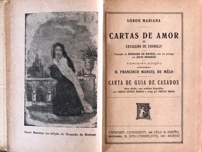 Fui para São Paulo. De fato, a Biblioteca possuía um livrinho, publicado em 1917, pela Editora Lelo & Irmão, do Porto, que continha as cinco Cartas de Amor, com o título completo de Cartas de Amor ao Cavaleiro de Chamilly, na tradução de Morgado de Mateus, com um Prólogo (uma Introdução) de Júlio Brandão, de dezesseis páginas, contida nas páginas vii a xxii. O livrinho dizia ser “Terceira Edição”, mas não informava sua data de publicação. Posteriormente descobri, através de outras fontes, que era 1917. Seu tamanho é 16×11 cm.