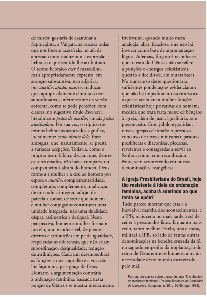 No Brasil, a IPB é, dentre as igrejas protestantes tradicionais, a principal e mais importante igreja que, de braços dados com a Igreja Católica Romana, não admite que mulheres façam parte dos órgãos diretivos, decisórios, doutrinários e pedagógicos da igreja, nem podem exercer as funções de Pastor (Presbítero Docente), Presbítero (Presbítero Regente) e Diácono, e nem mesmo a função de Professor de Classe de Escola Dominical de Homens Adultos, ou que contenham, adultos do sexo masculino. Tirando as funções manuais (cuidar de jantares, limpezas, etc.), a única coisa mais significativa que as mulheres podem fazer na Igreja é ser professora de crianças ou de outras mulheres. O “órgão de classe” das mulheres nas Igrejas Presbiterianas se denomina “Sociedade Auxiliadora Feminina”. Além de cuidar de limpeza e comida – nessa área elas têm hegemonia – tudo o que elas podem fazer é auxiliar os homens. Essa seria a única função que Deus teria lhe reservado na lenda da criação: a de ser adjutora, ajudante, do homem.